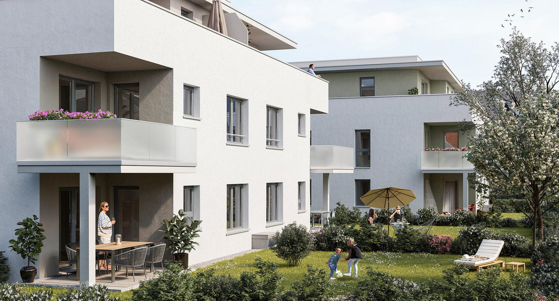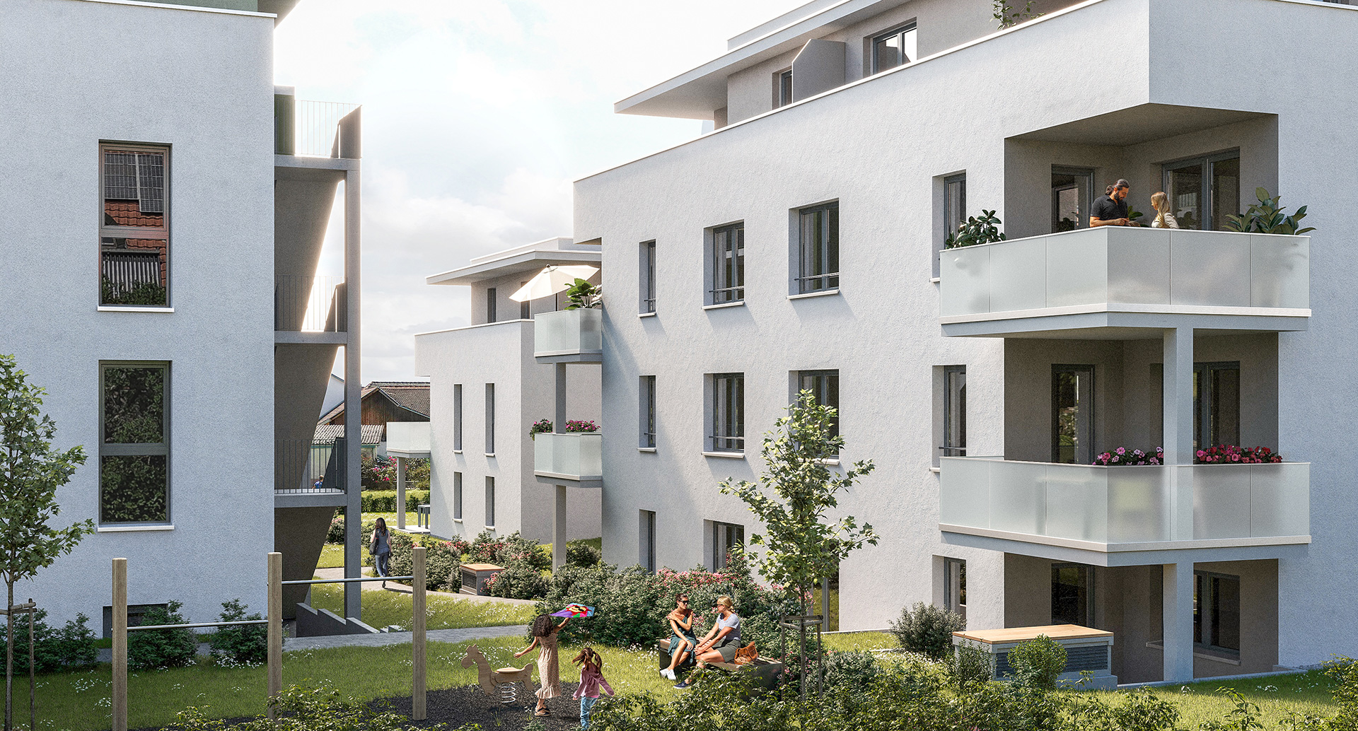 Im Außenbereich entsteht zwischen den Gebäuden ein gemeinsamer begrünter Innenhof, der neben Aufenthaltsflächen auch eine angrenzende Spielmöglichkeit für Kinder bereithält.