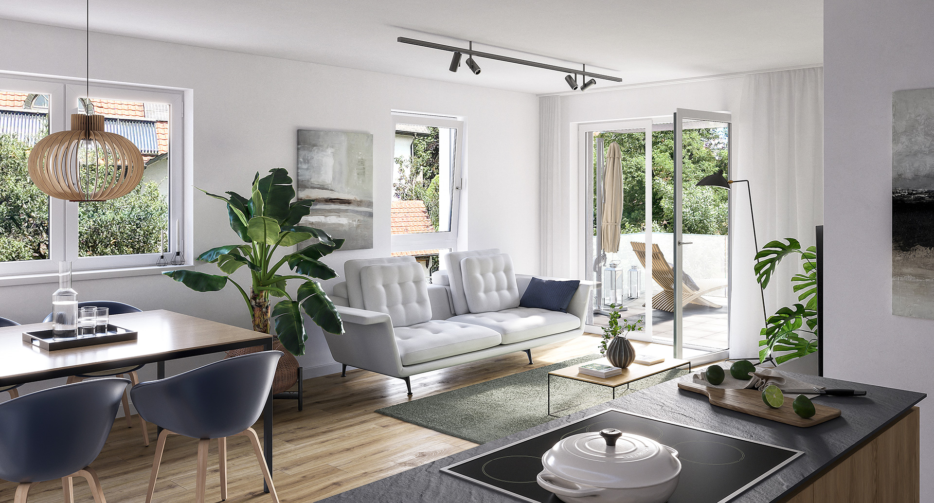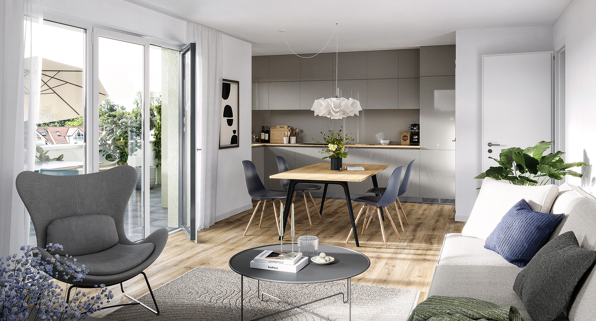 Von Parkett über hochwertiges Laminat bis Vinyl ist für jeden Wunsch etwas passendes mit dabei. Großformatige Fliesen in den Nassräumen und auf den Balkonen sowie Dachterrassen runden das moderne Gesamtbild ab.